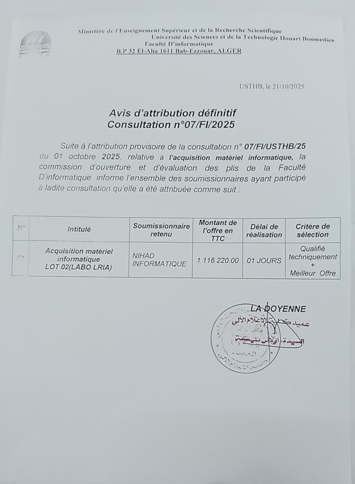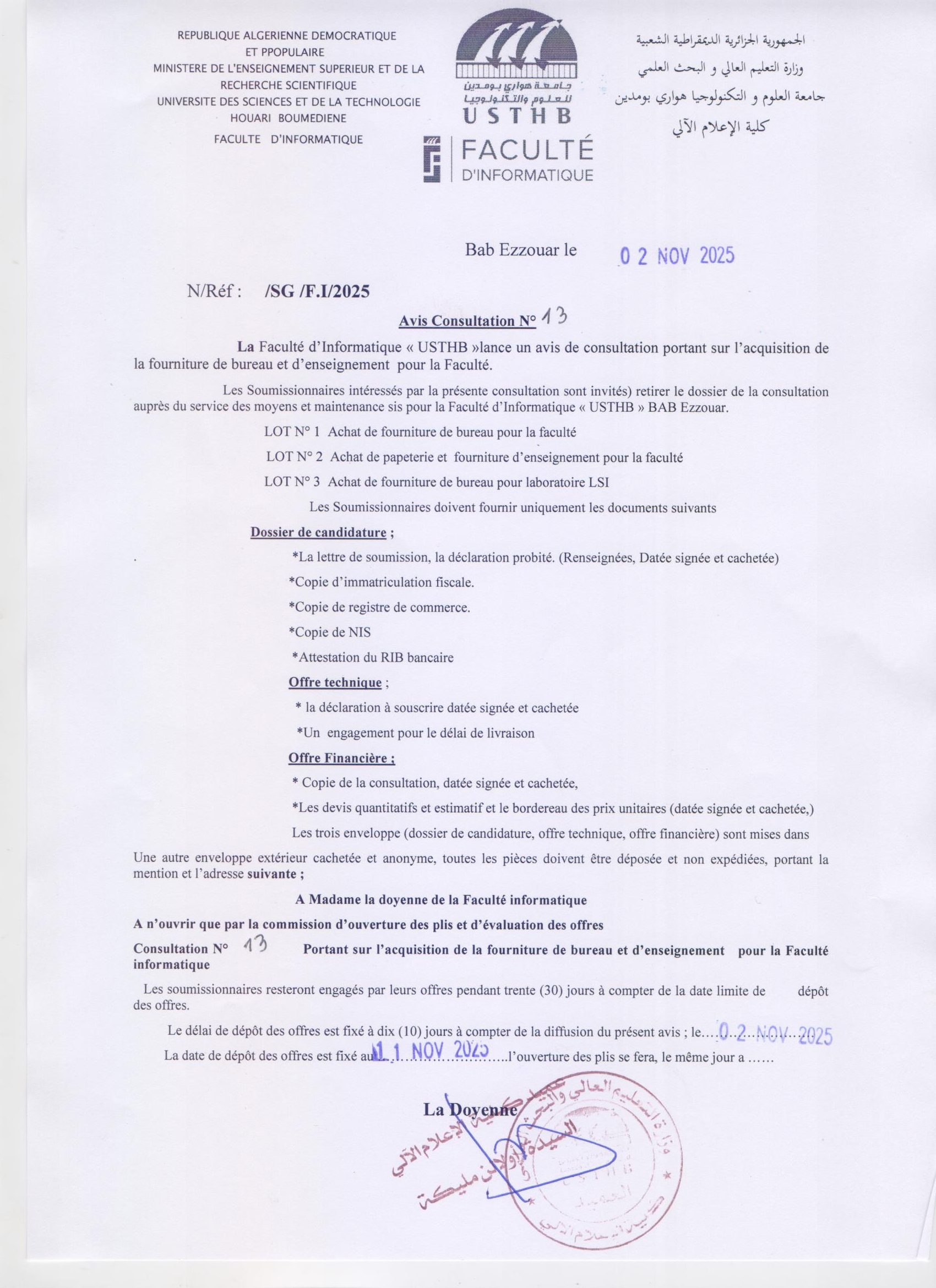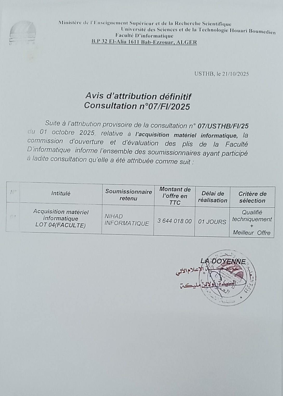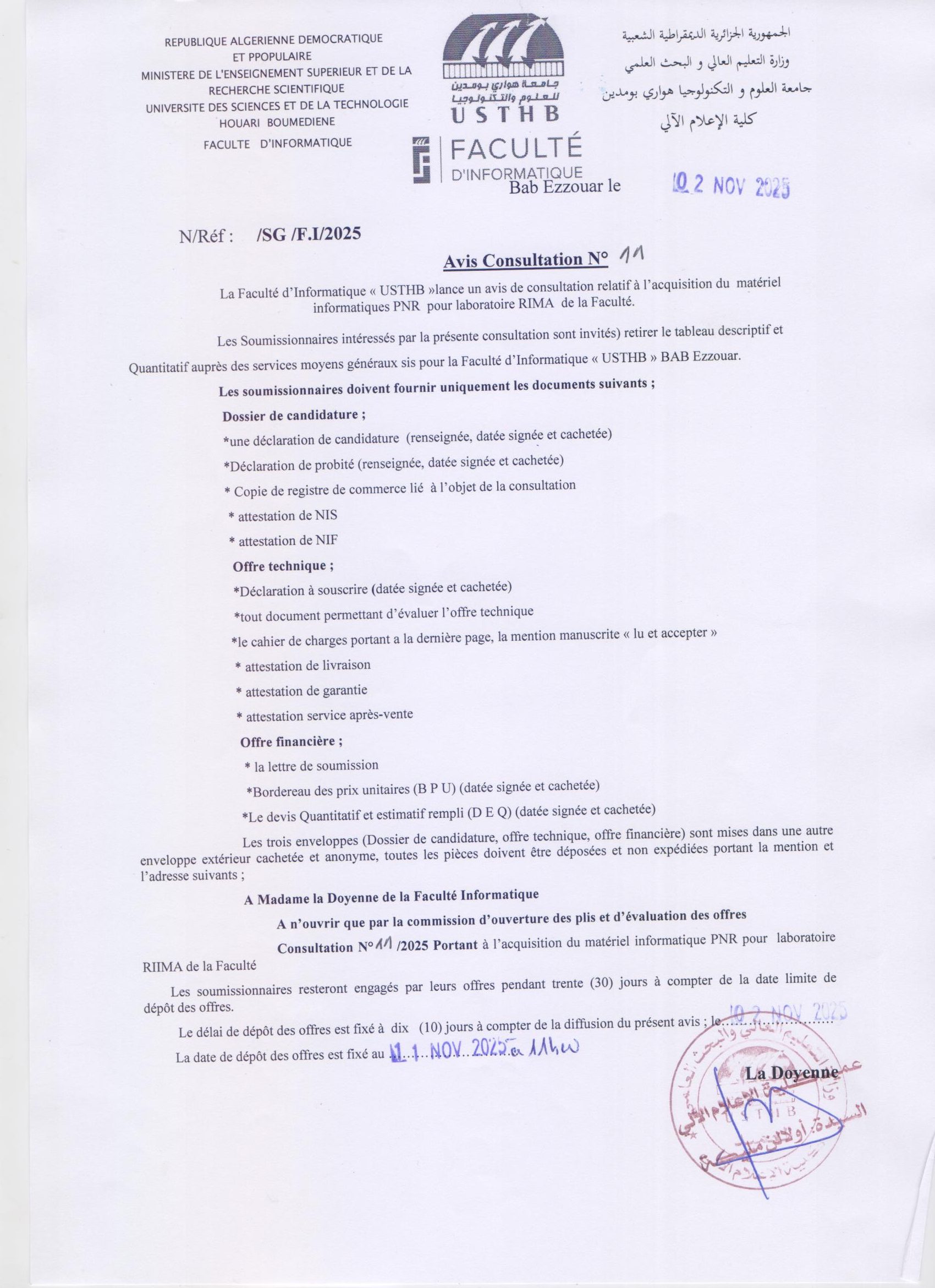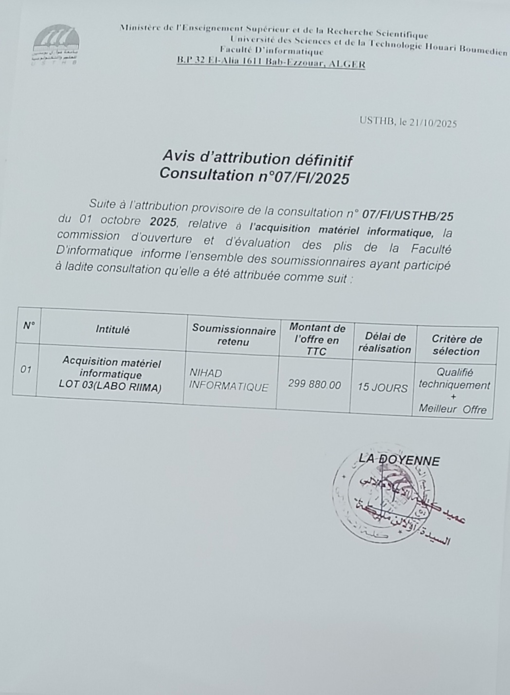- CONSULTATION RESTREINTE N° 1/2025 : La faculté d’Informatique (USTHB) lance une consultation restreinte pour l’Acquisition matérielle informatique pour la Faculté. Les soumissionnaires intéressés par la présente consultation, Cliquez ici.