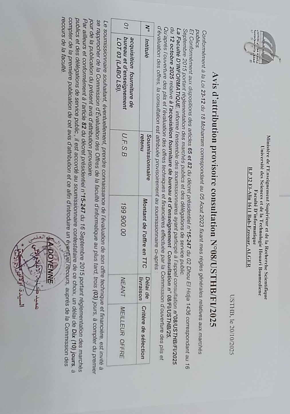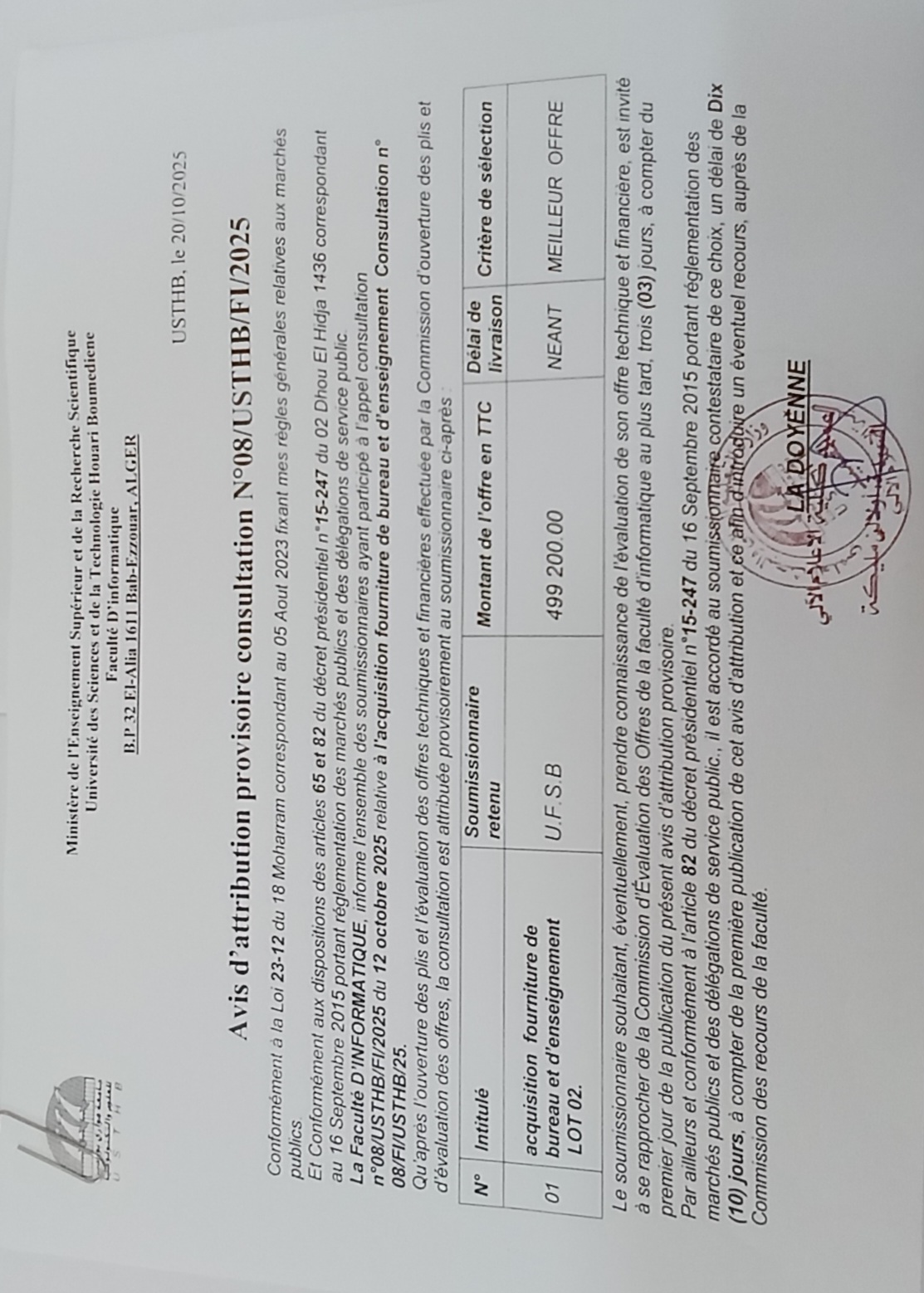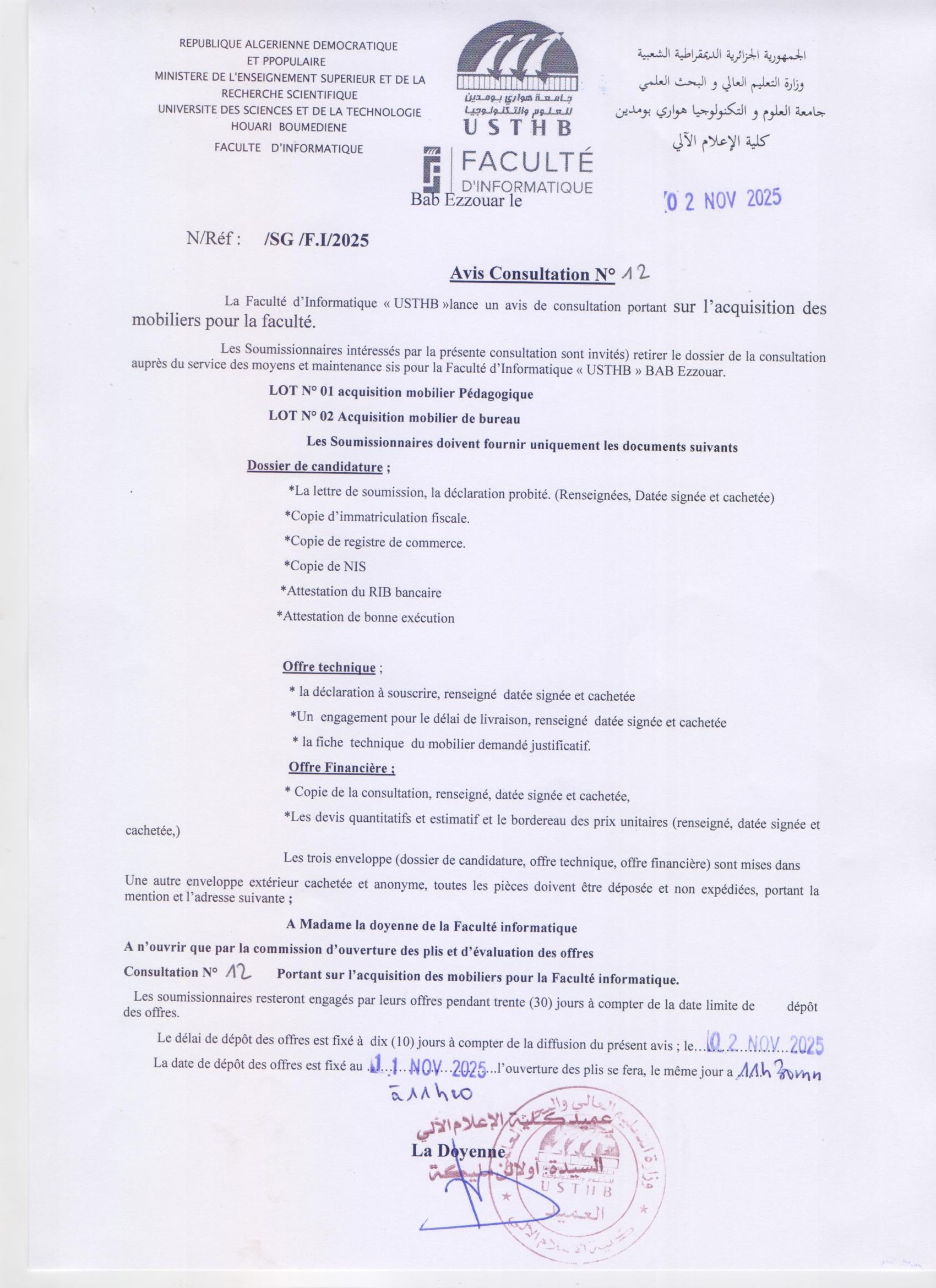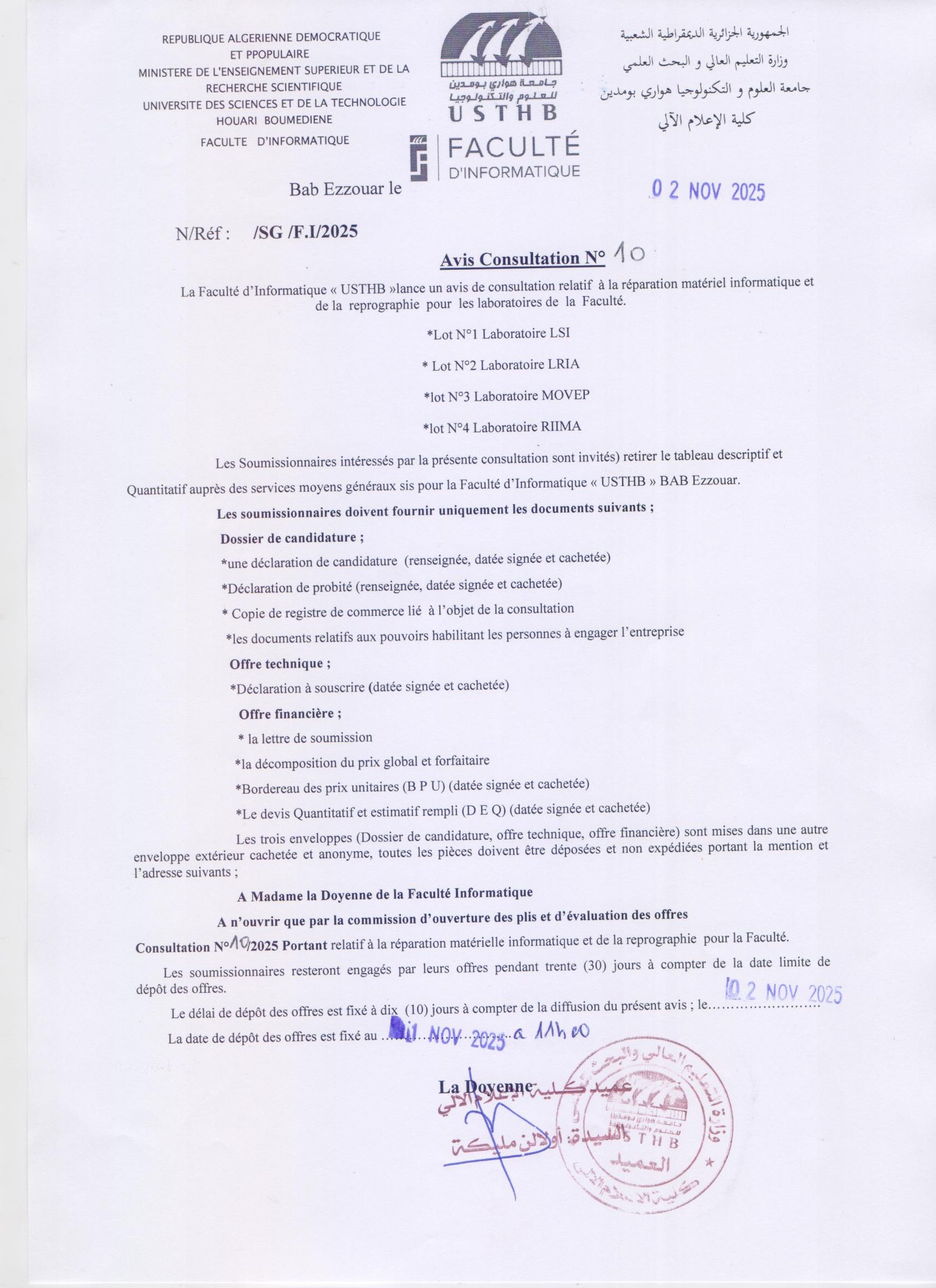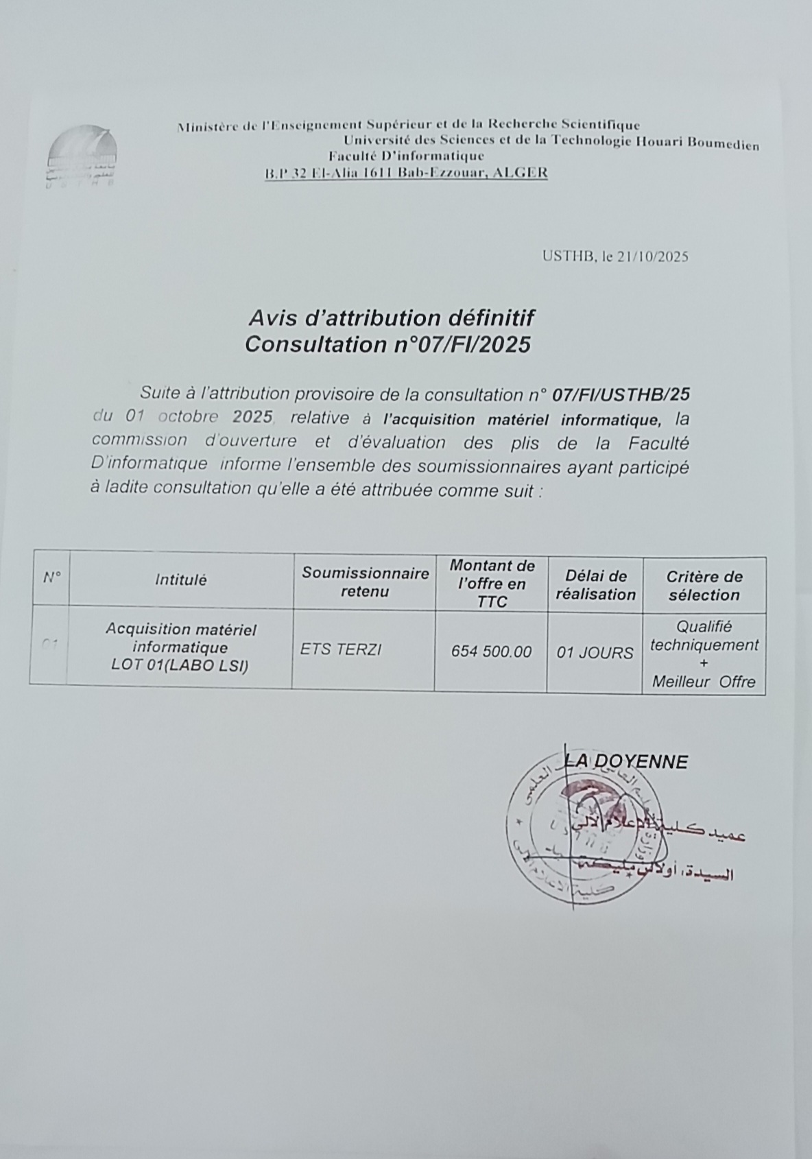 - CONSULTATION RESTREINTE N° 1/2025 : La faculté d’Informatique (USTHB) lance une consultation restreinte pour l’Acquisition matérielle informatique pour la Faculté. Les soumissionnaires intéressés par la présente consultation, Cliquez ici.