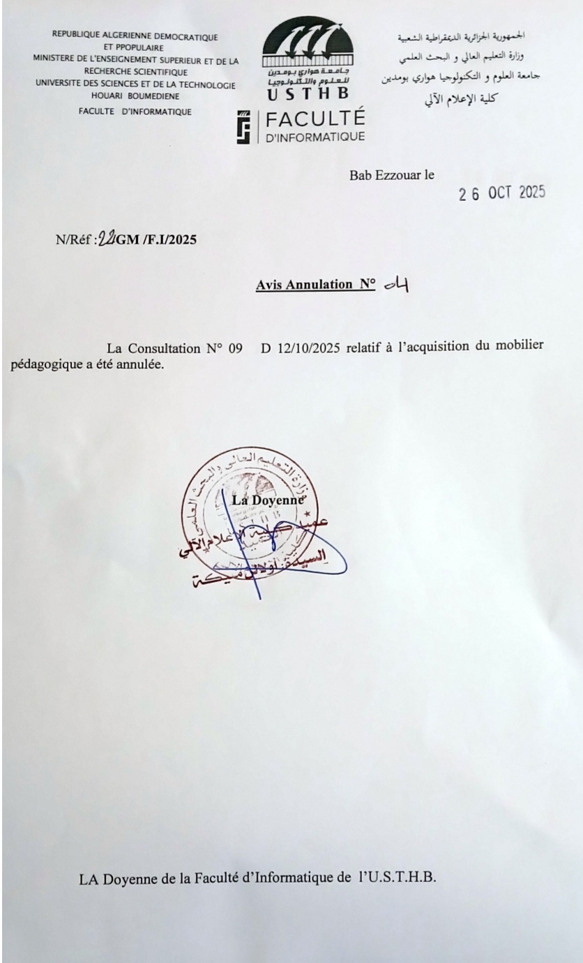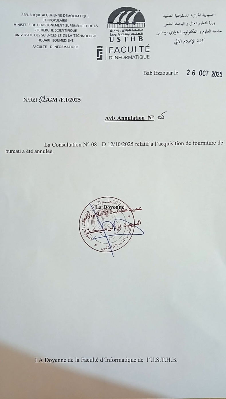 - Annulation RESTREINTE N°1/2025 : La faculté d’Informatique (USTHB) lance une annulation de consultation restreinte pour l’Acquisition matérielle informatique pour la Faculté. Les soumissionnaires intéressés par la présente consultation, Cliquez ici.